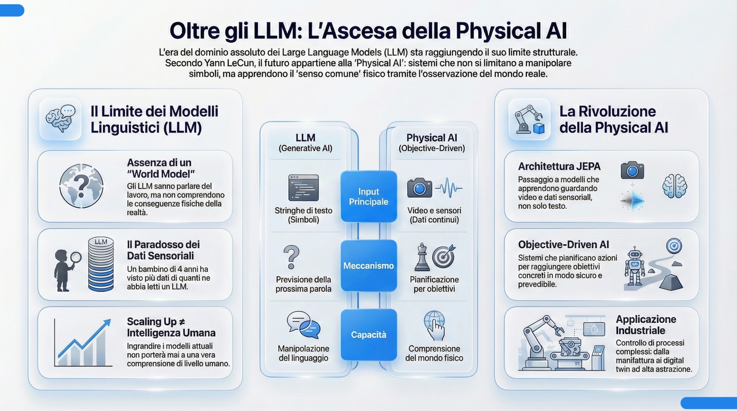 Il futuro dell’intelligenza artificiale sta cambiando rotta. Se negli ultimi anni il mercato è stato dominato dall’entusiasmo per i Large Language Models (LLM), oggi i leader tecnologici concordano: abbiamo probabilmente raggiunto il limite di ciò che il solo linguaggio può fare.